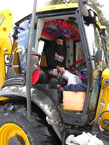 Then I discovered the Israeli snow ploughing machine. One rumbled past me the first day of the storm. I could not help but stop and stare in amazement as it scraped the pavement. Wait a minute, that’s not a snowplough. That’s a backhoe with a front-end dirt-digger, I observed. As I positioned myself to take a picture the driver politely stopped, opened his door and smiled for the camera. His sudden celebrity status was as charming as the appearance of his inner cabby, ornately decorated for … Christmas!