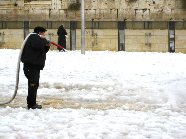 But wait, it gets even more interesting. The ground keepers of the Western Wall ditched shovels and snowploughs altogether. They had a better idea. Remove the 12-plus inches of snow on the Kotel – the plaza in front of the Western Wall – with water! To my disbelief, I witnessed a member of the Western Wall maintenance crew slinging a firehose over his shoulder spraying the ground. Has he not been informed that water freezes into ice? With all due respect for his sincere efforts to clear the snow, I’m not convinced a “Western Wall Ice Rink” would be a welcomed attraction to Judaism’s holiest religious site.