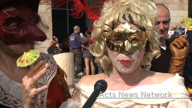 Purim is an occasion for the corporate reading of the book of Esther – in synagogues, often in a light-hearted and joyous fashion. At Jerusalem’s reform Kol Ha Neshama Synagogue, congregants came for the reading dressed in costume.